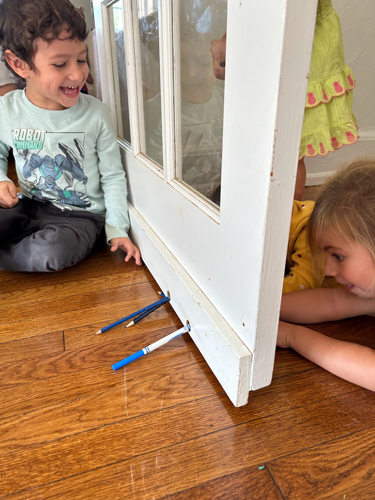 | In the Rainbow Room, children tried using brads to make art that moves.Some children had never used a hole puncher. |